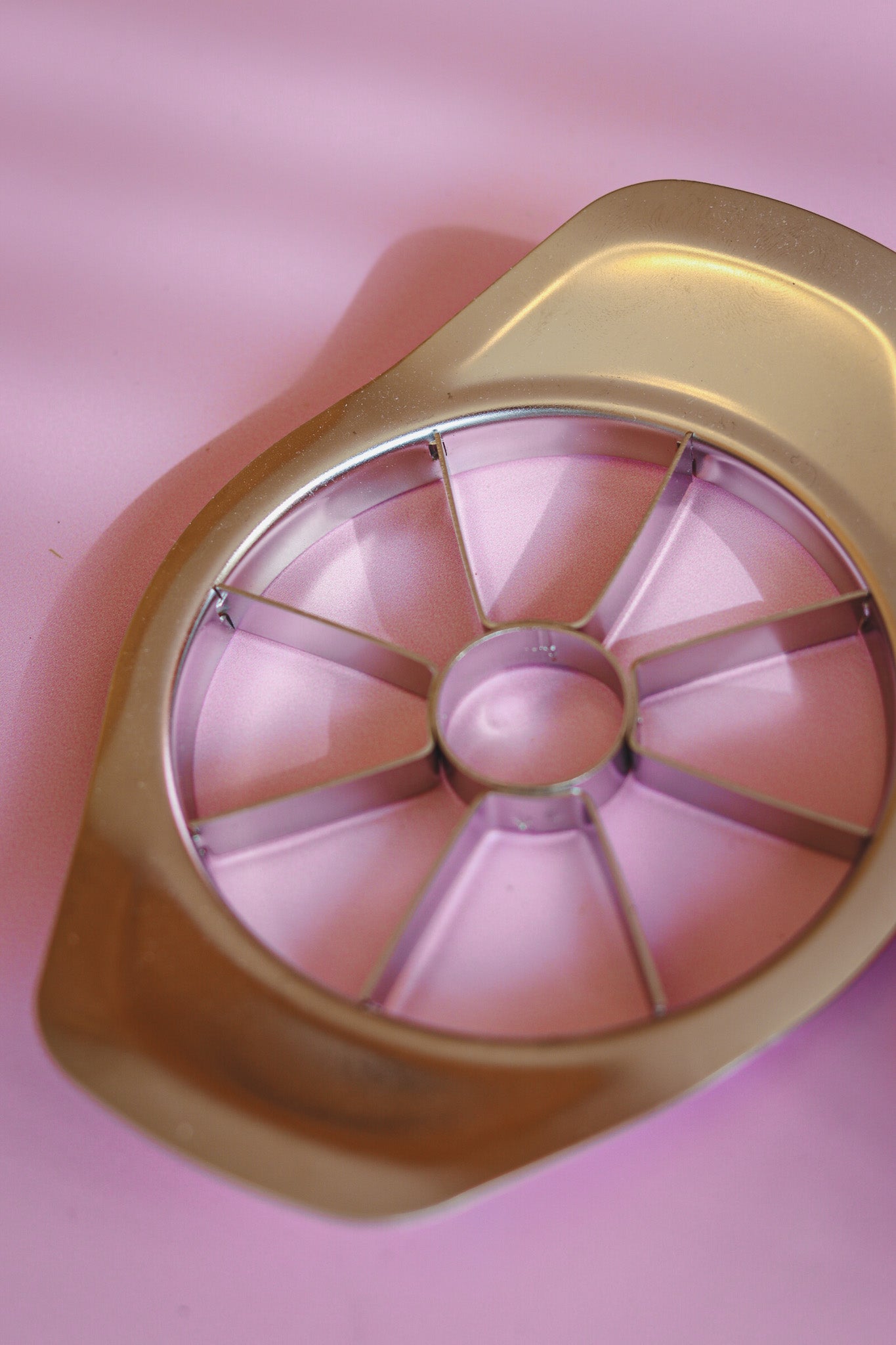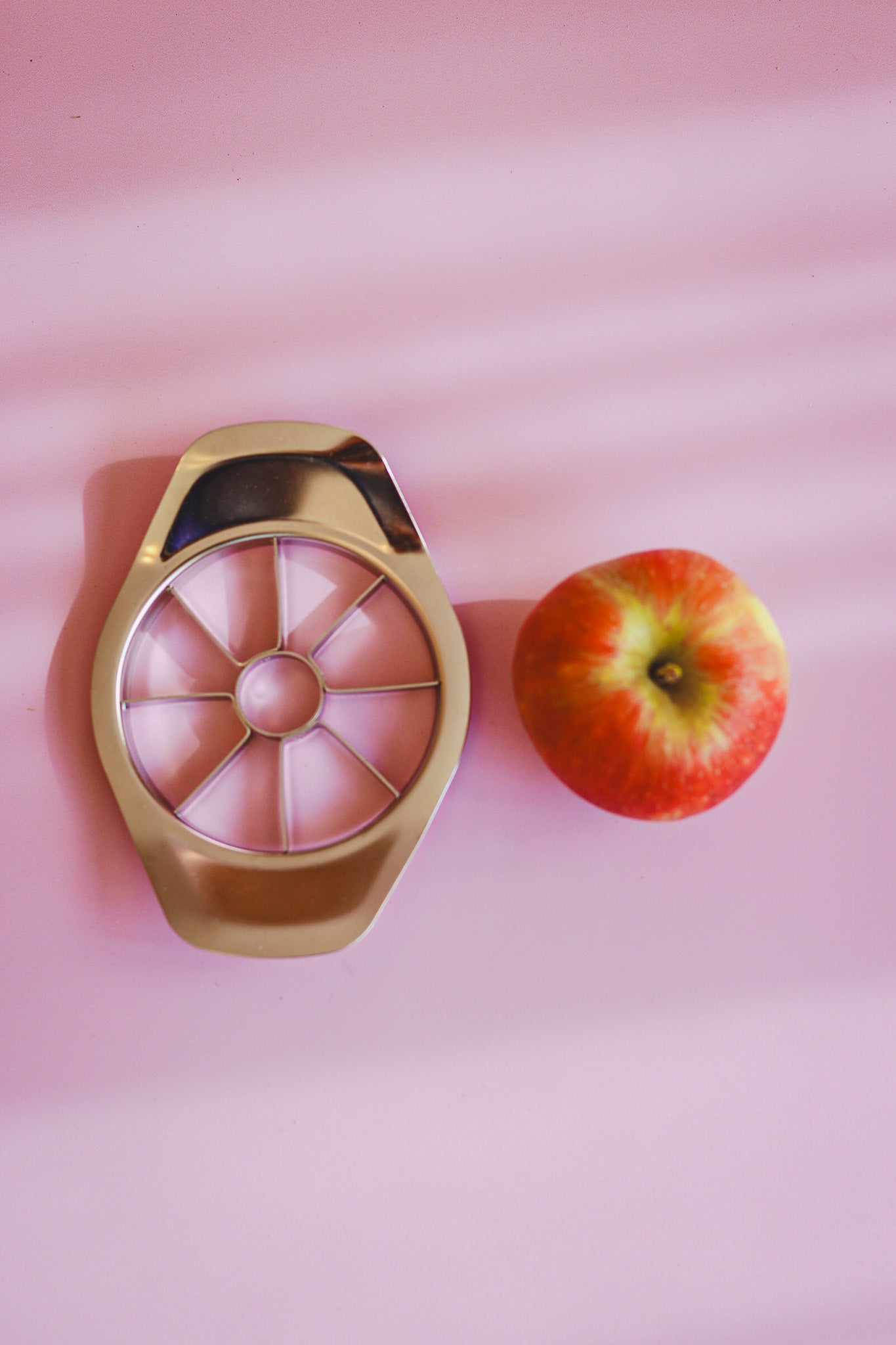 Handige RVS-appelsnijder waarmee kinderen zelfstandig hun appel in acht partjes kunnen verdelen en het klokhuis veilig verwijderen.