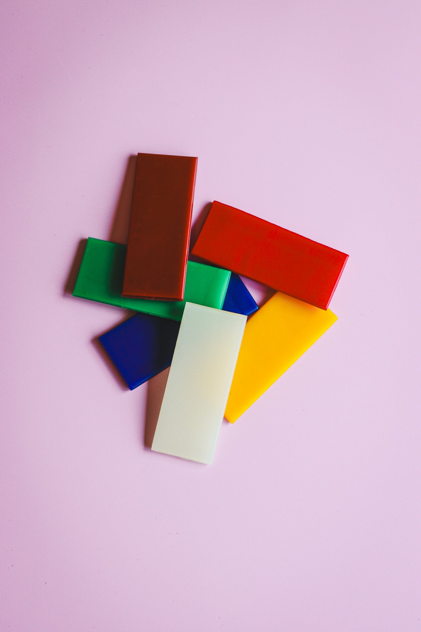 Kartonnen etui, 6 plakjes van 100x40x6 mm, 6 kleuren: 00 ivoor | 01 karmijnrood | 04 goudgeel | 07 groen | 09 blauw | 13 roodbruin.