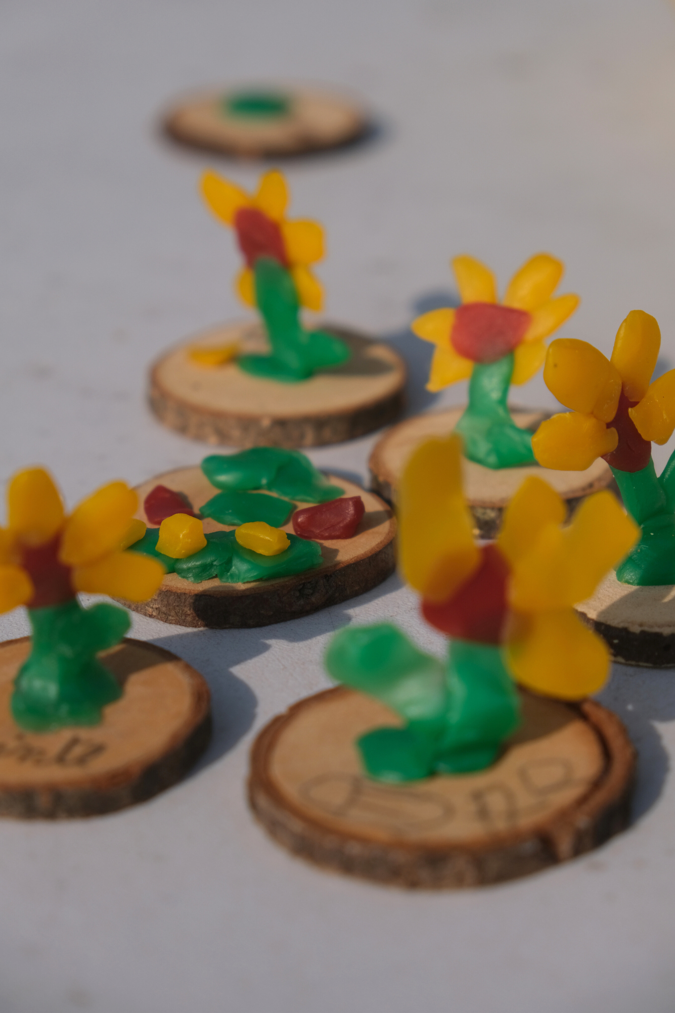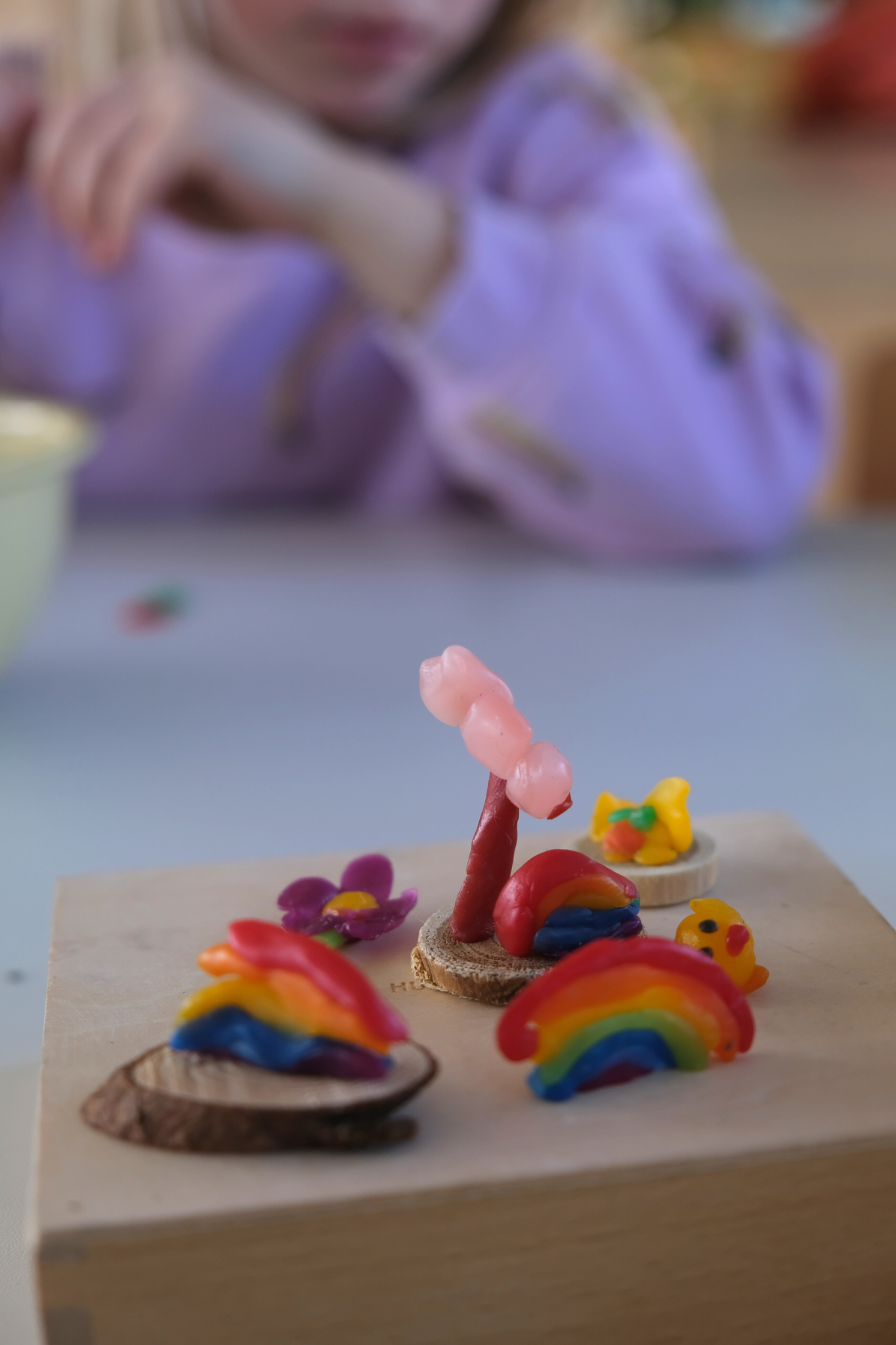 Tip: Ik knip bijenkneedwas altijd in kleine dobbelsteentjes en bied zo een kleurrijke mix aan van een paar kleine stukjes. Dat maakt het makkelijker om mee te werken én veel duurzamer. Kinderen hebben niet veel nodig van dit materiaal. Ik vertel de kinderen graag dat bijen kleine, hardwerkende diertjes zijn die veel moeite doen om deze was te maken. Daarom gebruiken we de bijenkneedwas om kleine, zorgvuldige kunstwerkjes te maken – voor de grotere creaties is klei geschikter. Bijenkneedwas is bovendien erg temperatuurgevoelig. Is het koud in de winter en voelt de was hard aan? Dan kan je hem even opwarmen, zodat hij weer soepel en goed kneedbaar wordt.