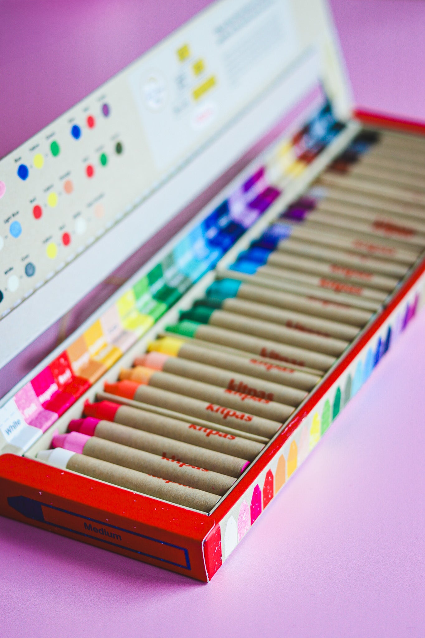 Deze krijtjes kleuren niet alleen prachtig op papier, maar ook op ramen, glas, spiegels en whiteboards. Ze zijn eenvoudig te verwijderen met een natte doek – behalve op papier, waar de ‘vettigheid’ en intense kleuren juist een bijzonder effect geven.