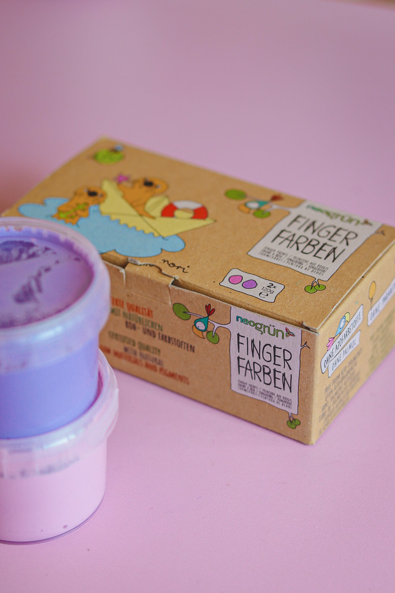 Set van 2 potjes natuurlijke vingerverf – in pastelkleuren: roze en paars. Deze vingerverfset bestaat ook in 4 pastelkleuren en 4 basiskleuren.